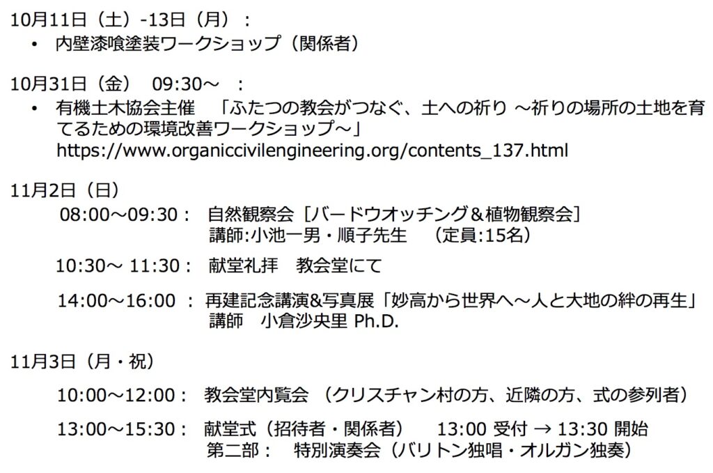 - また、一次審査から始まって二次審査を経て最終審査に至る過程での建築士の皆様とのコミュニケーションは、創立から 60年になる ICA・妙高高原教会にとって、まず「教会堂を再建する意味」と「次世代に向けてこれから何をなすべきか」という原点を思い起こし、次の世代につなげて行くための可能性を現実に結びつけていく為の貴重なきっかけとなりました。