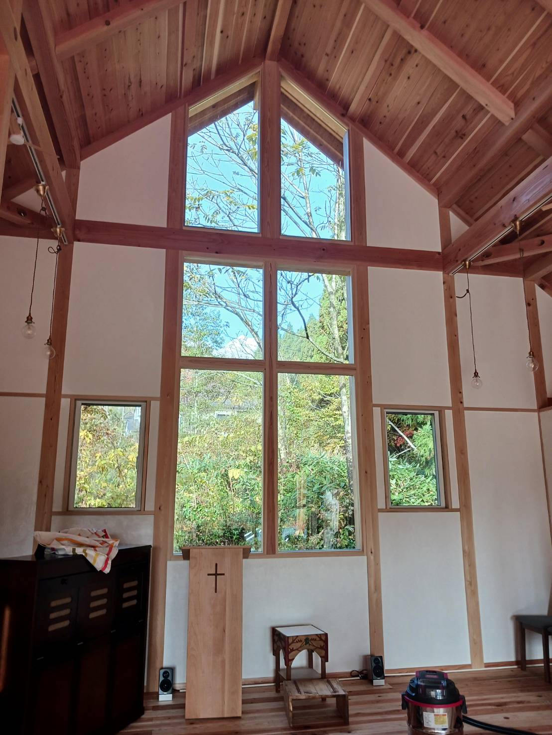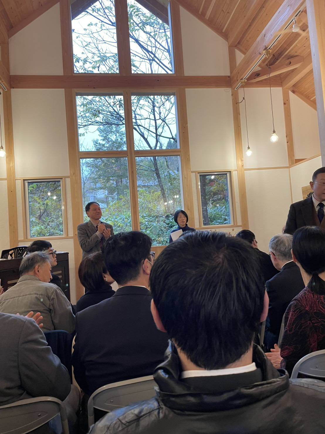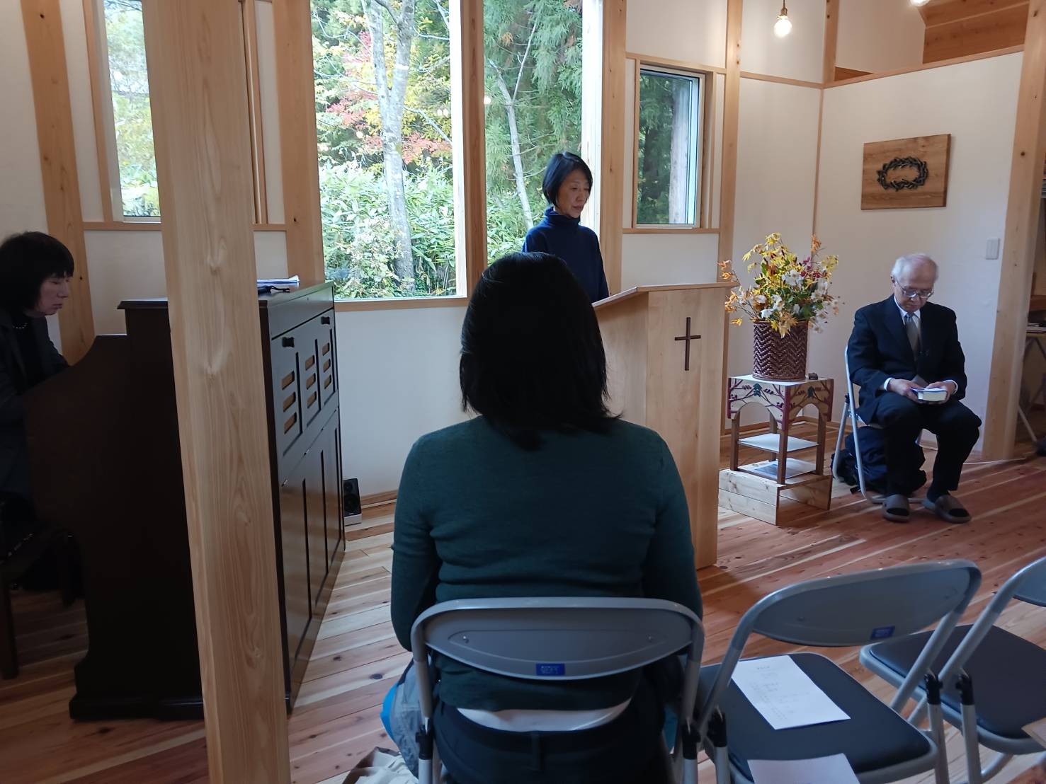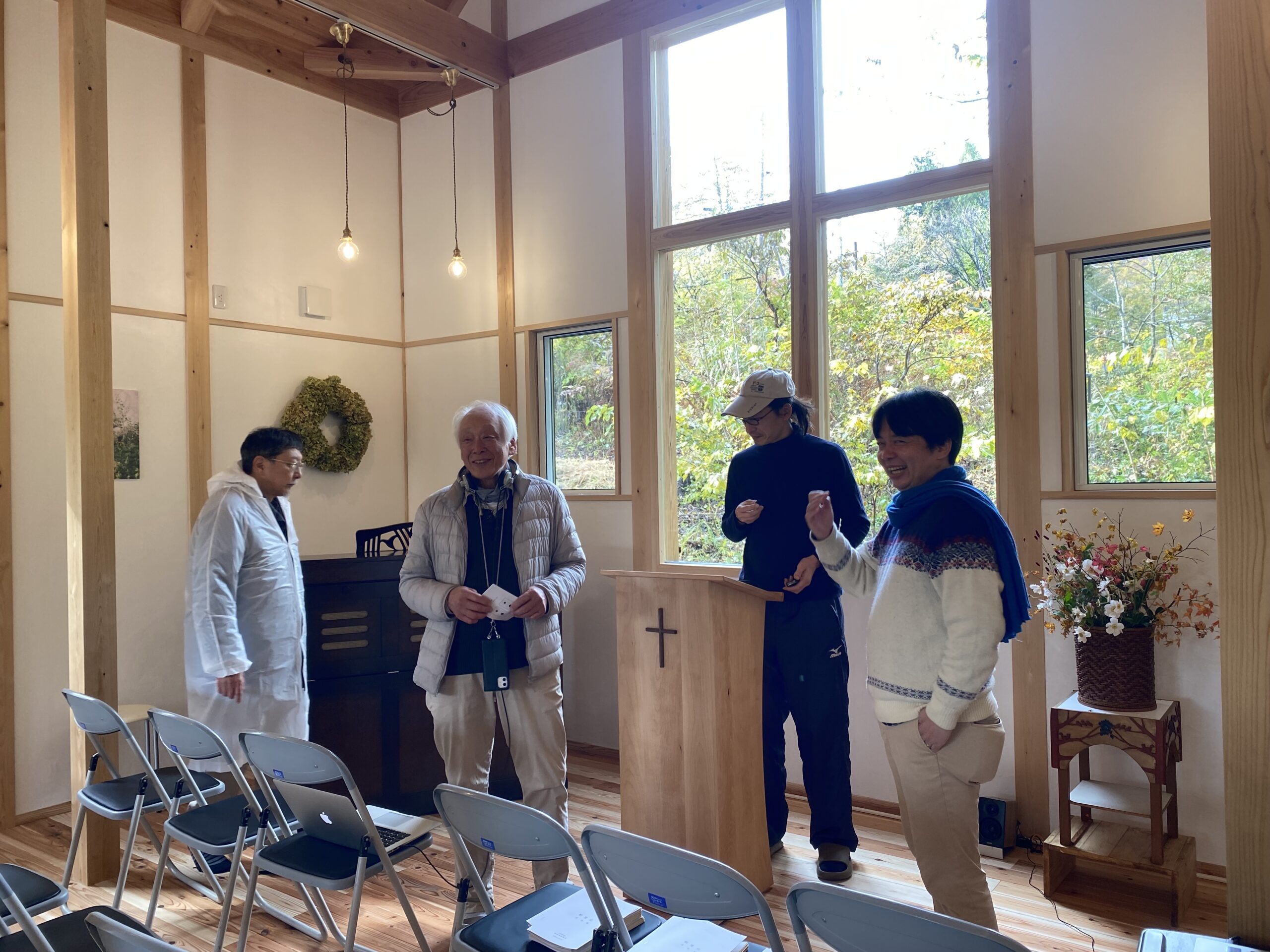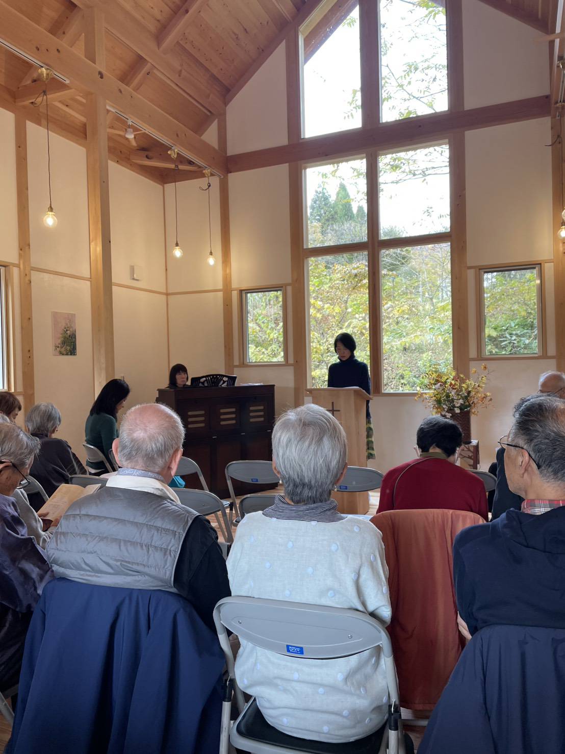 クリスチャン村の会員とその家族、近隣の早乙女さん、妙高こうげんむらの方々も参列。 教会堂の十字架の大窓から美しい晩秋の妙高山を望むことができる新教会堂での最初の礼拝を守りました。
