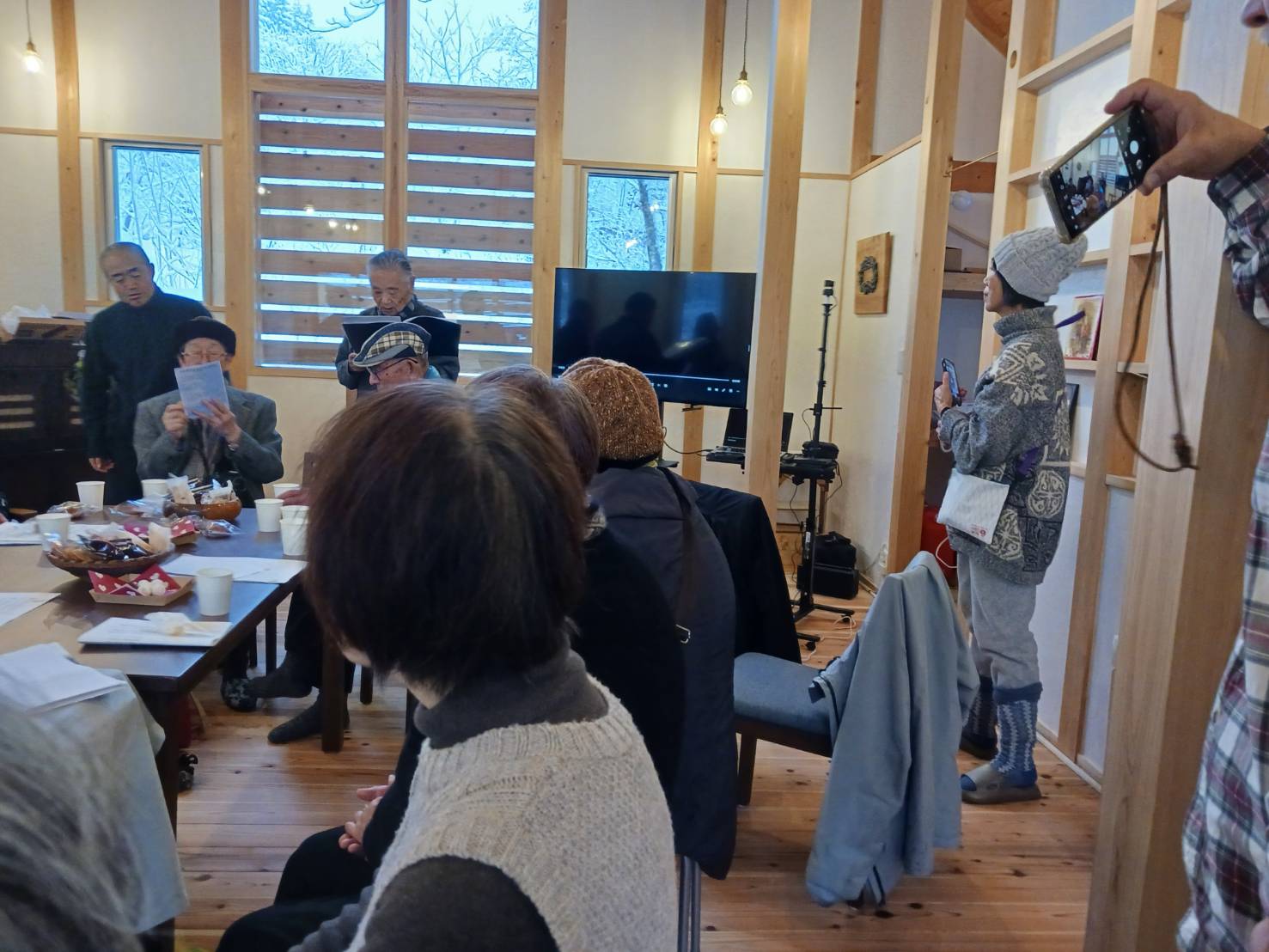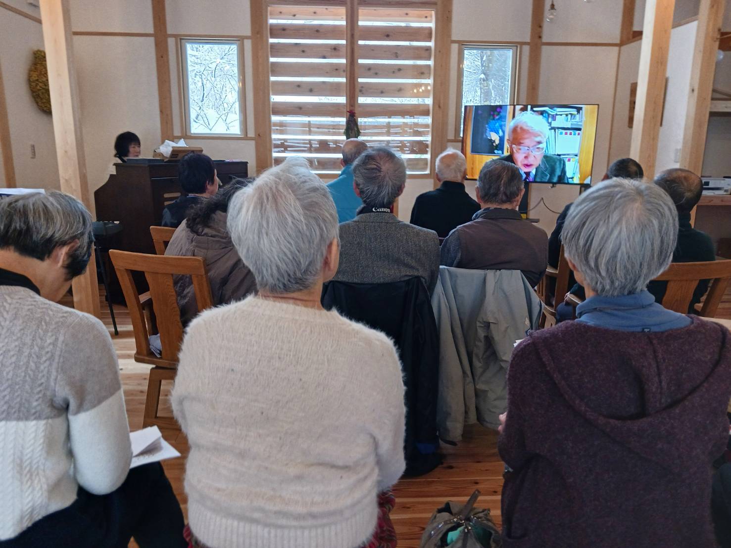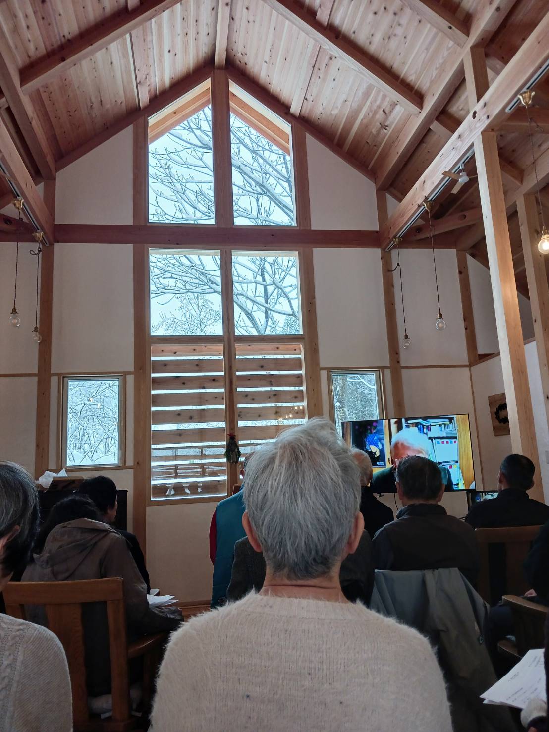ICA 会員、妙高こうげんむら、近隣の皆さまにお集まり頂き、妙高高原教会・小友牧師のビデオ礼拝をモニターで流してクリスマス礼拝を行いました。 リードオルガンの奏楽と「妙高山麓男声合唱団」の歌声が流れる和やかで温かいクリスマス礼拝になりました。