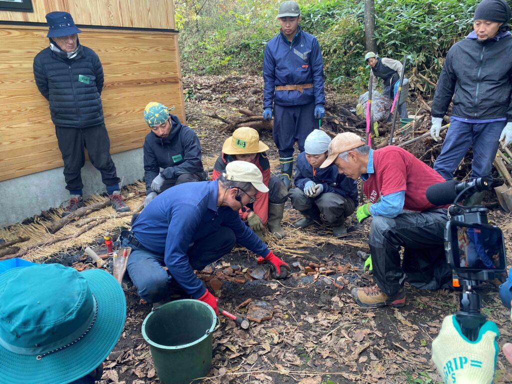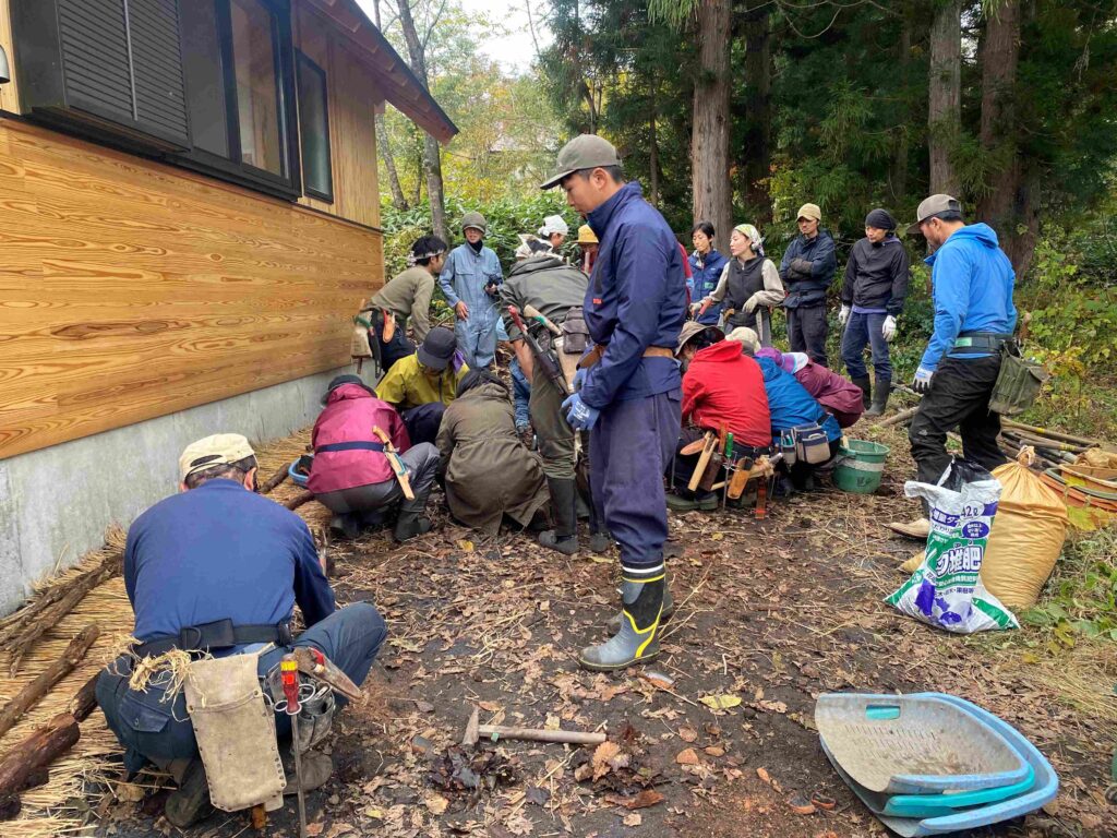 学び、体感する機会となりました。 西側の斜面から流れてくる雨水・雪解け水を建物が直接受けないようにするための水の流れを誘導する土木工事がなされ、屋根からの水がスムーズに土中に浸透するために、石、瓦、藁、枯葉、燻炭などの資材を用いる伝統的な土木造作の知恵を実際にワークを進めながら学ぶことができました。 (ワークショップ ワーキング 佐藤のぞみ)