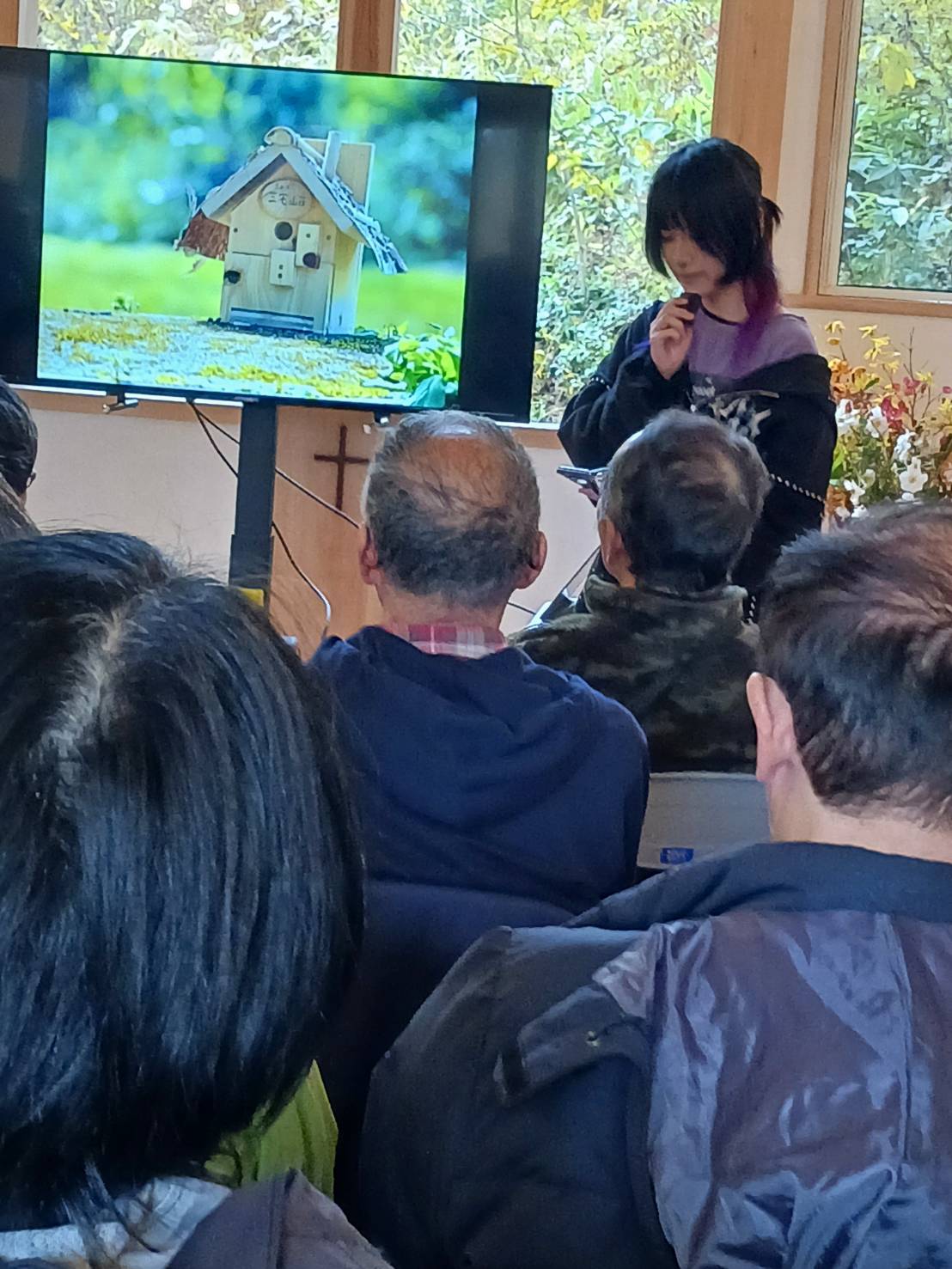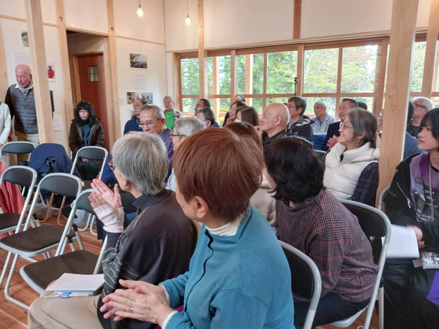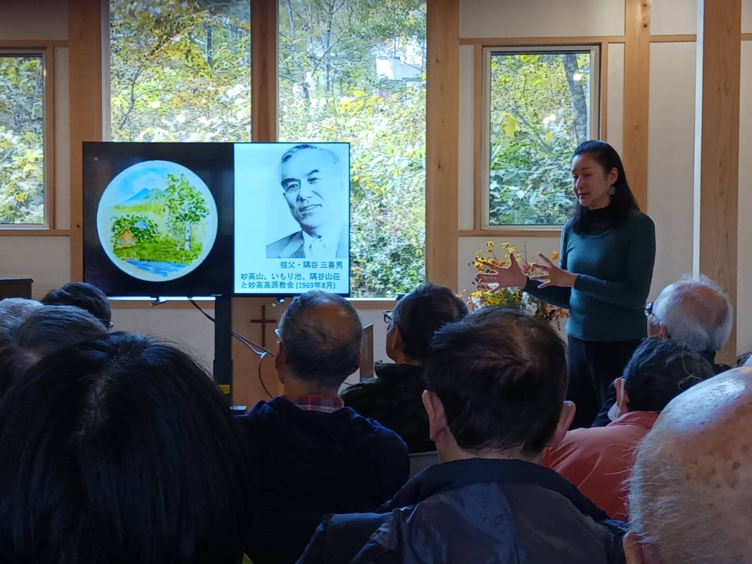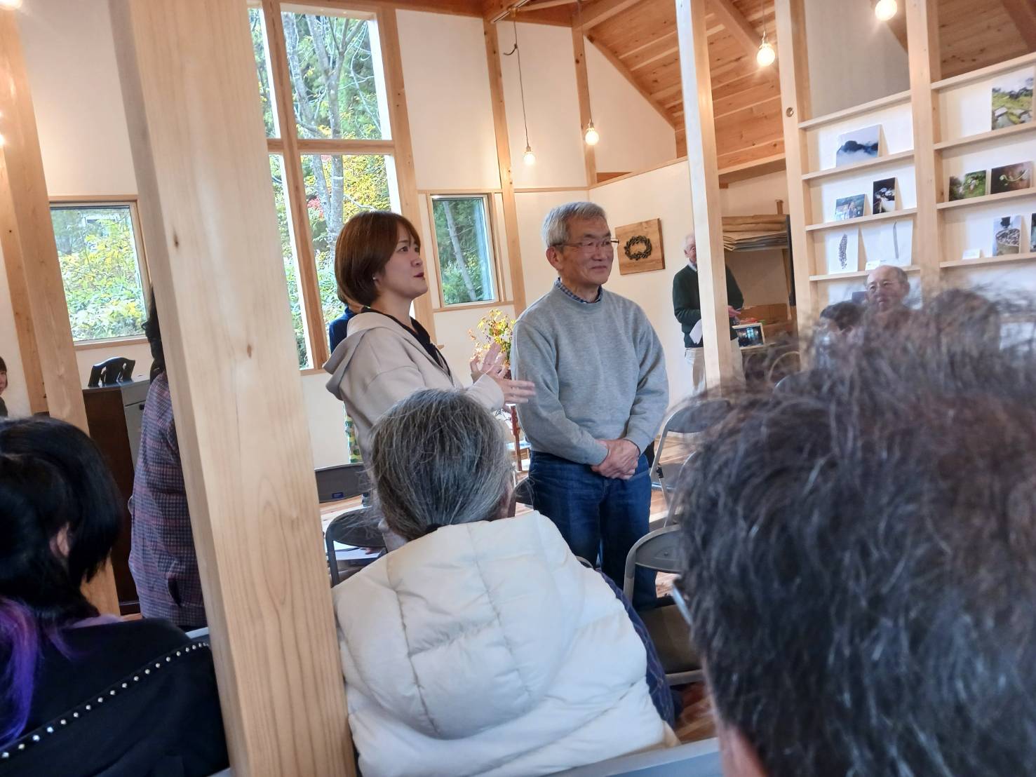 献堂式に先立ち、 日曜日に ICA 会員、NPO法人・妙高こうげんむら、近隣の皆様が集まって「献堂礼拝」を開催し、午後にはブリティッシュコロンビア大学で博士号を取得し、マサチューセッツ大学研究員として「伝統的な暮らしや農業の知恵」を研究している小倉紗央里さんによる講演会が開催されました。