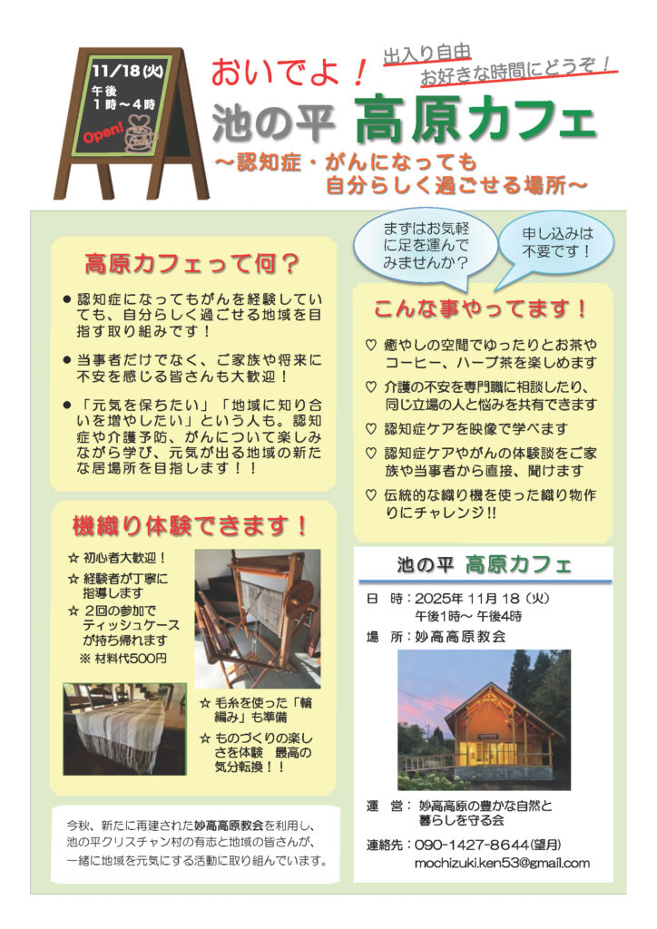 献堂式開催後に「ビジターと近隣に開かれた教会」の企画として、「妙高高原の豊かな自然と暮らしを守る会」の主催による「高原カフェ」の開催が実現しました。 これは「認知症カフェ」のコンセプトを拡げて、近隣住民の皆さまに気楽に集まって頂けるイベントとして「機織り体験」や認知症ケア技法の「ユマニチュード」関連のビデオ・書籍紹介などを組み合わせた企画です。 症状の有無に関わらず、40名以上の方々が教会堂の癒やしの空間に集って、会話に花を咲かせて楽しい時間を過ごしました。