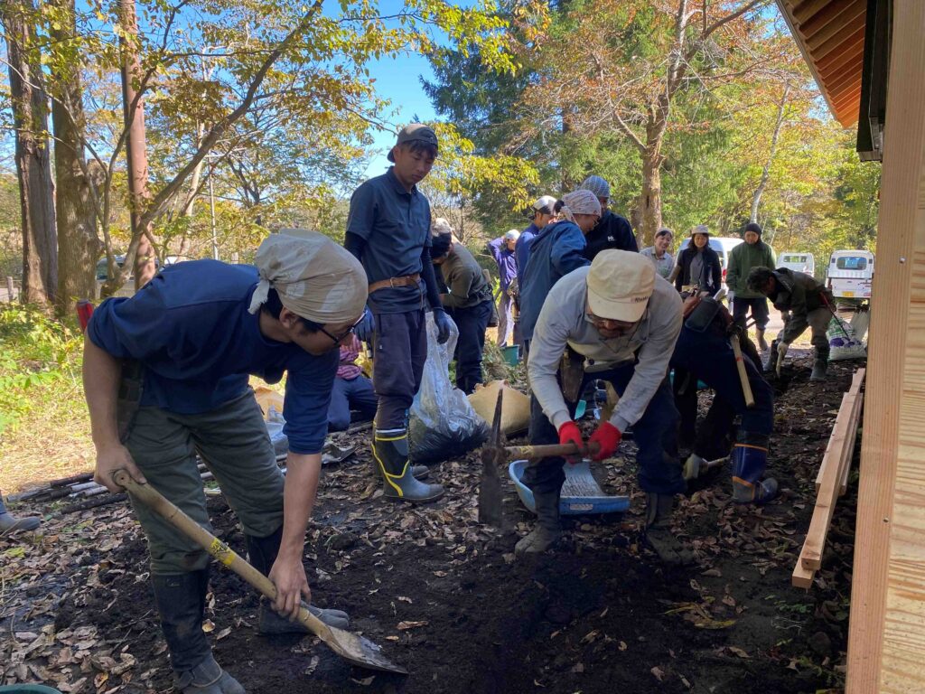 献堂式に先立ち、近隣の地域の方々やクリスチャン村、遠方からの参加者を交えて、豪雪地帯の斜面に建つ教会堂が自然と共生していくために必要な庭周辺の造作と必要なケアの方法を