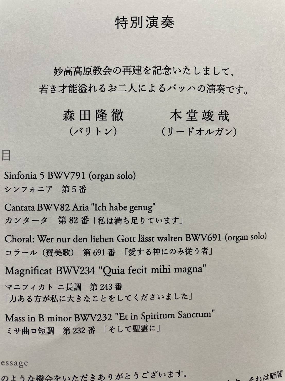 第二部は東京藝大の学生であるバリトンの森田隆徹さん、リードオルガンの本堂俊哉さんの特別演奏があり、バッハの美しい調べと力強い歌声が高い天井のある会堂内に響き渡りました。